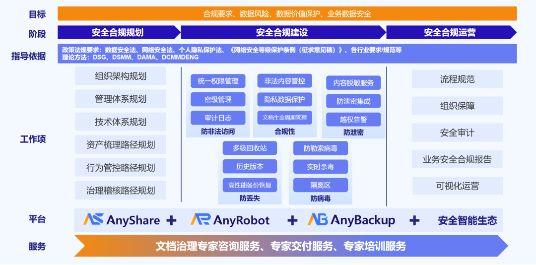 爱数深入洞察国内、外相关安全合规的法规政策,比如个人信息的保护法,网络信息的安全法、欧盟的GDPR等,结合十几年客户实践经验,推出文档治理体系专业服务,帮助客户梳理业务场景,并结合内容生命周期管理,自上而下的设计内容安全治理建设路径。
