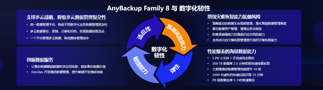 AnyBackup Family 8 多云时代统一管理平台,在适应性、抵御风险能力、弹性、敏捷性等方面,以更强的产品能力和创新技术,全方位助力客户增强数字化韧性。