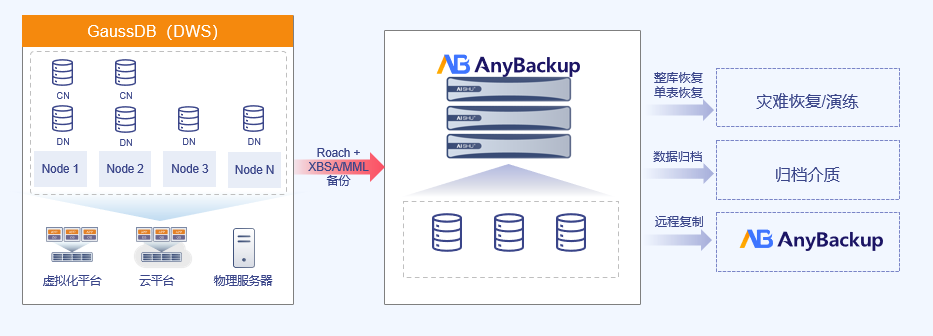 面向主流国产数据仓库,AnyBackup 凭借重复数据删除、永久增量备份、多节点并发备份恢复、表粒度备份恢复、数据一致性保障等多种技术的加持,可提供更高效、更安全的保护,即使在 PB 级数据量、百节点集群规模下也能有不凡的表现。同时,结合数据不可变、物理隔离等技术,实现备份数据防篡改,加固了勒索病毒的最后一道防线。在数据安全存储的基础上,可支持基于磁带、云存储等多种介质的归档方式,符合合规性需求。