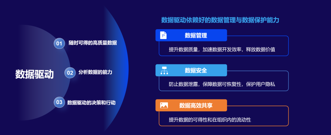 以数据管理与保护能力为核心的数据驱动将是构建数字化韧性的关键组成部分。通过数据管理提升数据质量,加速数据的开发和利用效率。通过数据保护保障核心数据资产不丢失,并防止隐私数据泄露,是实现数据高效利用的前提条件。凭借有效的数据管理与保护,数据能高效地在企业内外部流动、共享、利用,从而释放数据价值。