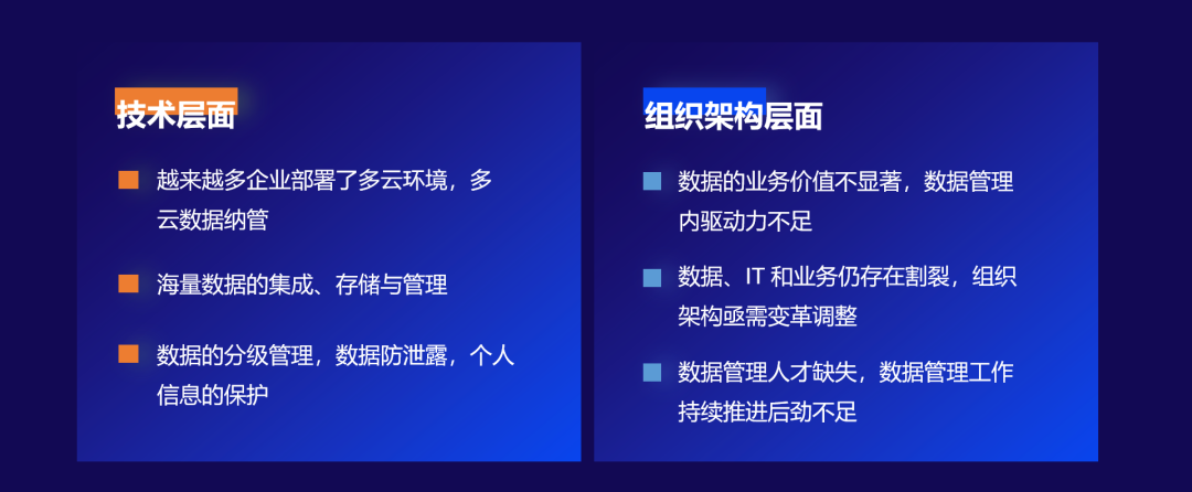 不仅如此,在组织架构层面同样遭遇挑战,如数据业务价值不显著导致数据管理与保护的驱动力不足,数据、IT、业务架构割裂导致的孤岛、数据人才的缺失等。