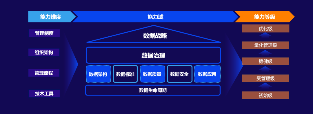 DCMM(数据管理能力成熟度评估模型)作为我国数据管理领域首个国家标准,定义了数据管理 8 个能力域,细分为 28 个能力项,从组织、制度、流程和技术四个方面考察企业数据管理能力,划分为 5 个能力等级,各能力等级主要区别在于数据管理范围和管理过程,这也是我国最权威的数据管理方法论。