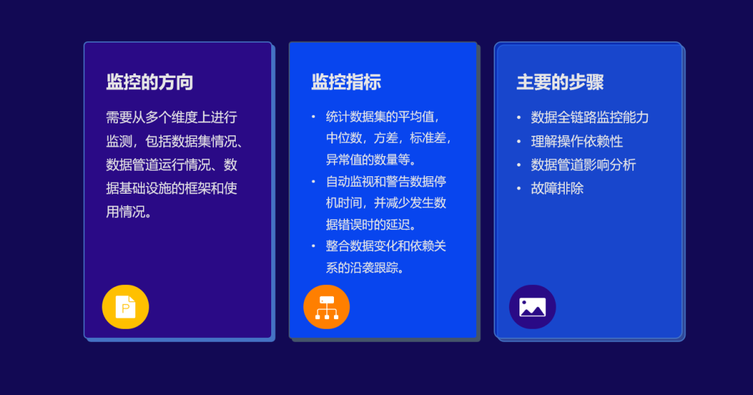 数据可观测性提供端到端监控,并利用机器学习来识别数据问题,评估失败的影响和根本原因。它助力组织进行数据集情况、数据管道运行情况、数据基础设施的框架和使用情况等多维度监测,以自动化来识别数据质量问题,防止下游数据问题。