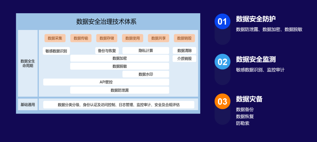 数据安全治理能力需要体系化地进行构建,从规划、建设、运营、优化等端到端全方位构建数据安全治理体系。数据保护作为数据安全治理体系的重要组成部分,也需要构建完备的技术体系。数据安全保护类核心技术主要包括数据安全防护、数据安全监测、数据灾备等三类核心技术,每个组织几乎都需要部署5种以上的数据安全技术,才能形成一个纵深的技术体系安全防御体系。