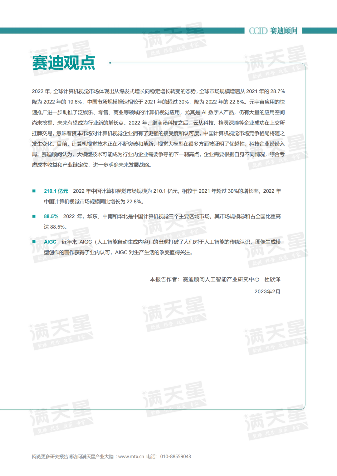 回顾2022年,全球计算机视觉市场体现出从爆发式增长向稳定增长转变的态势,其中,中国市场规模增速相较于2021年的超过30%,降为2022年的22.8%。2022年,云从科技、格灵深瞳等企业成功在上交所上市,意味着资本市场对计算机视觉企业拥有了更强的接受度和认可度,中国计算机视觉市场竞争格局或将随之发生变化。预计未来3年,元宇宙应用的快速推广将进一步助推泛娱乐、零售、商业等领域的计算机视觉应用,有望成为行业新的增长点。