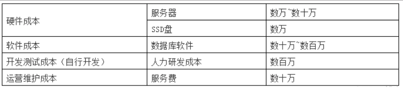 成本可以分为开发测试成本、数据库的软硬件成本、运营维护成本等。开发测试成本主要是开发该项目的人力成本,这个因项目而异。分布式数据库的硬件成本主要包括PC服务器加本地SSD盘,软件成本因厂商而异。有其他文章进行过比对,引用如下: