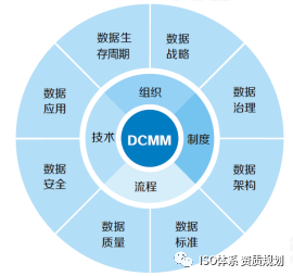 DCMM数据管理能力成熟度评估模型定义了数据战略、数据治理、数据架构、数据应用、数据安全、数据质量、数据标准和数据生存周期八个核心能力域及28个能力项445条标准进行评估。