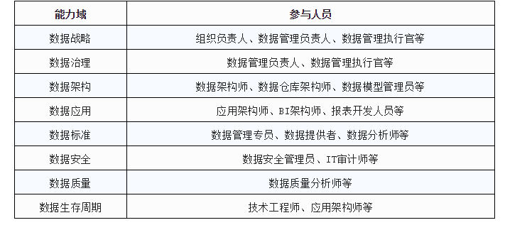 从企业评估过程中来看,一般来说,数据战略和治理需要的是管理人员,其余6个能力域需要的是技术人员,从实际评估角度来说,企业匹配人员一般在3-8个,在申请比较低的等级过程中,一个人可以覆盖2~3个能力域。