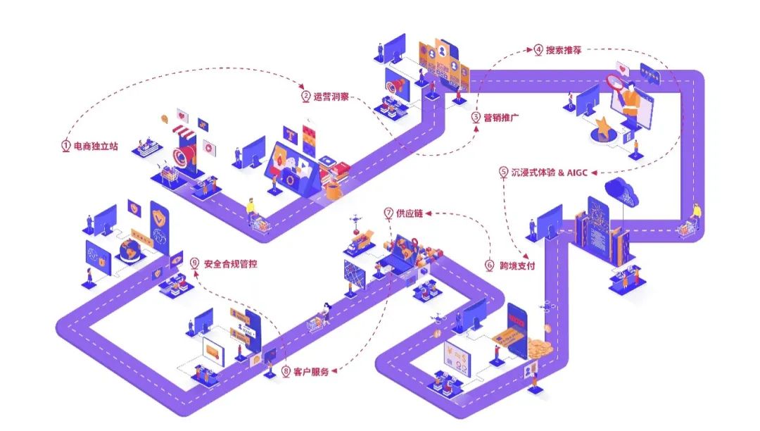 亚马逊云科技联合合作伙伴、亚马逊全球业务体系,支持电商企业更便捷地服务全球消费者,布局全球,打造全球品牌。亚马逊云科技在全球的合作伙伴超过12万,覆盖150多个国家,依托亚马逊云科技,开发出业界领先的电商行业解决方案,赋能跨境电商企业的每一个运营环节,包括独立建站、运营洞察、营销推广、沉浸式体验与 AIGC、跨境支付、搜索推荐、供应链与物流仓储,以及客户服务、安全合规管控等,为电商企业的全球发展保驾护航。同时,亚马逊在全球业务体系,包括亚马逊电商,亚马逊广告,亚马逊物流,Alexa 智能语音服务等,为中国电商客户海外业务拓展打开更广阔的空间。比如亚马逊物流拥有覆盖全球超200个国家和地区的智能物流运营网络,帮助电商企业解决跨境物流的挑战;Fire TV 和亚马逊广告帮助跨境电商客户触达全球用户。