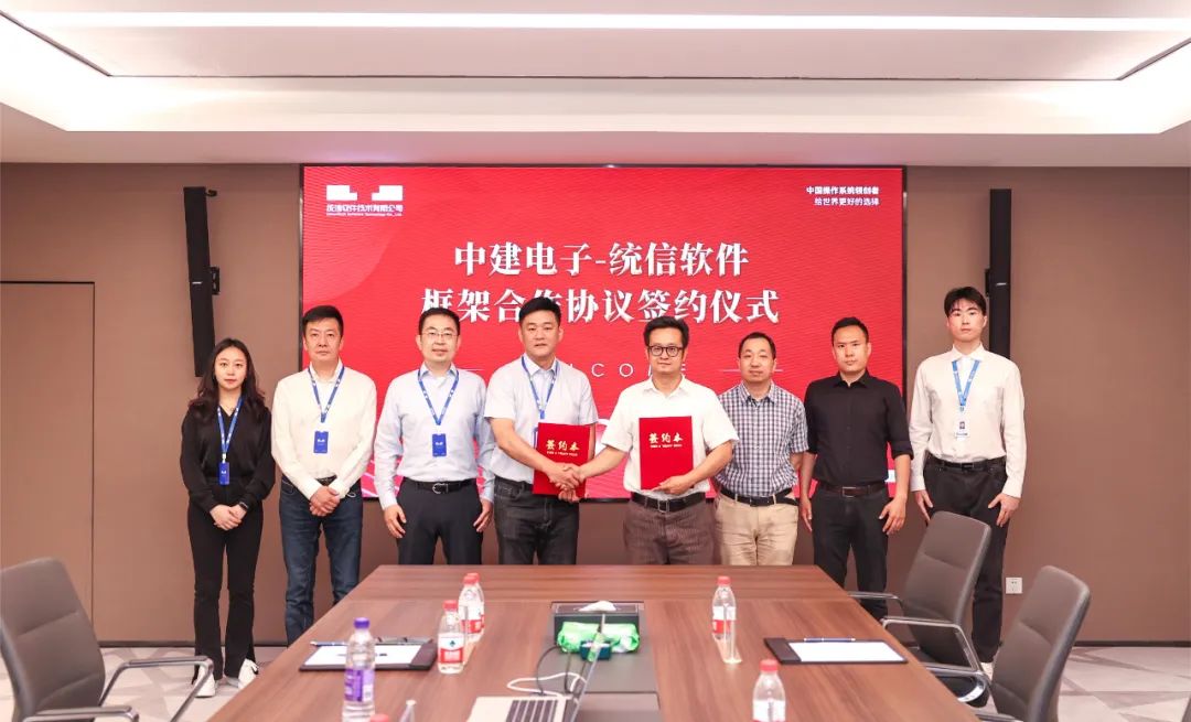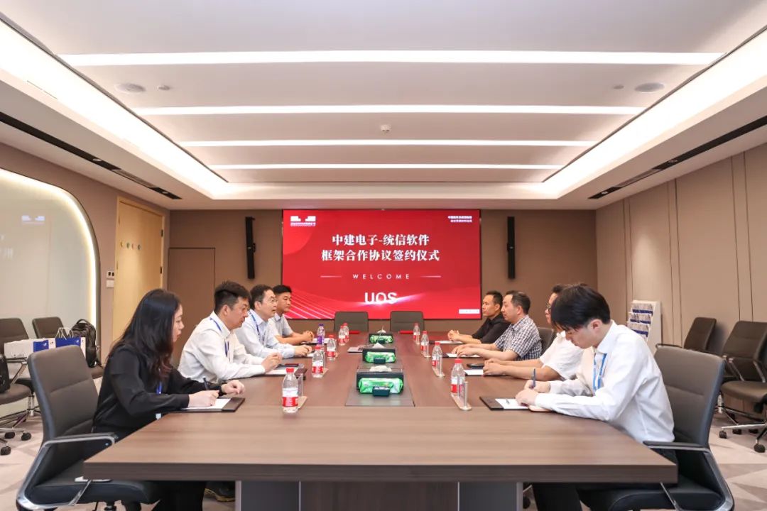 中建电子副总工揭臣兵,信创事业部经理张文涛,信创事业部副经理张宝军,与统信软件央企事业部总经理李岱璋,央企业务部负责人邓明等出席仪式并见证签约。