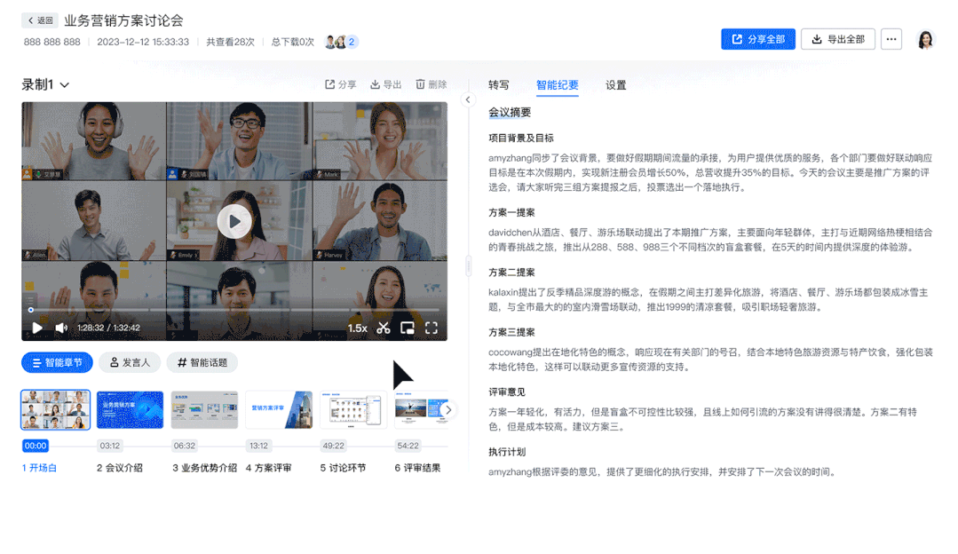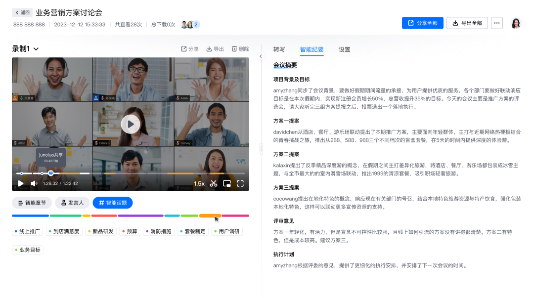 如今,“智能话题”归纳功能,可以基于会议内容自动总结相关热点话题,清晰看到会议中重点聊的方向以及相关内容,更个性化地回顾会议。