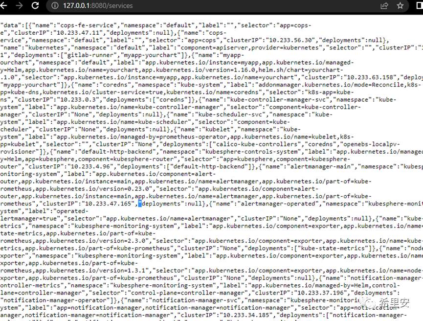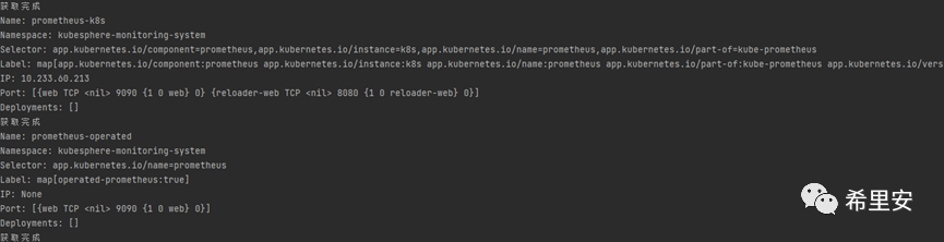 package mainimport ("context""fmt""time"metav1 "k8s.io/apimachinery/pkg/apis/meta/v1""k8s.io/client-go/kubernetes")func main() {// 创建Kubernetes客户端,使用InClusterConfig获取集群内部configconfig, err := rest.InClusterConfig()if err != nil {panic(err.Error())}clientset, err := kubernetes.NewForConfig(config)if err != nil {panic(err.Error())}// 获取Namespace列表,使用ListOptions设置超时时间避免长时间等待ctx, cancel := context.WithTimeout(context.Background(), 5*time.Second)defer cancel()namespaces, err := clientset.CoreV1().Namespaces().List(ctx,metav1.ListOptions{})if err != nil {panic(err.Error())}// 遍历每个Namespacefor _, namespace := range namespaces.Items {// 为每个Service创建context,单独设置超时时间ctx, cancel := context.WithTimeout(context.Background(),3*time.Second)defer cancel()// 获取Namespace下的Service列表services, err := clientset.CoreV1().Services(namespace.Name).List(ctx,metav1.ListOptions{})if err != nil {panic(err.Error())}// 遍历每个Service,获取详细信息for _, service := range services.Items {// 为获取Deployments创建context,设置超时时间ctx, cancel := context.WithTimeout(context.Background(),3*time.Second)defer cancel()// 获取Service对应的Deploymentsdeployments, err :=clientset.AppsV1().Deployments(namespace.Name).List(ctx,metav1.ListOptions{LabelSelector: service.Spec.Selector})if err != nil {panic(err.Error())}// 输出Service详细信息,增加相关注释fmt.Printf("Name: %s\n", service.Name) // Service名称fmt.Printf("Namespace: %s\n", namespace.Name) // 所在Namespacefmt.Printf("Label: %s\n", service.Labels) // Service标签fmt.Printf("Selector: %s\n", service.Spec.Selector) // Service选择器fmt.Printf("IP: %s\n", service.Spec.ClusterIP) // 集群IPfmt.Printf("Port: %v\n", service.Spec.Ports) // 端口信息fmt.Printf("Deployments: %s\n", deployments.Items) // 关联的Deploymentsfmt.Println() // 空行}}}