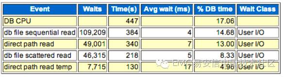 可以看到,需要优化存储的性能指标是这样的,总CPU等待时间才17%(利用率低),剩下有42%的时间花在等待数据文件中的User I/O 。反过来,如果数据库慢,DB时间大部分花在CPU处理上,那么这个数据库的优化应该在服务器,而不是存储。好了,下面的实际案例来了: