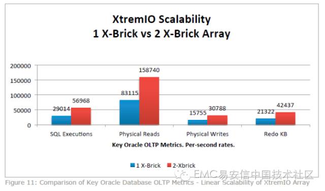 这个案例中,工程师证明了XtremIO从单节点扩展到两个节点后,性能按照线性增长,基本上处理能都翻倍,看下图: