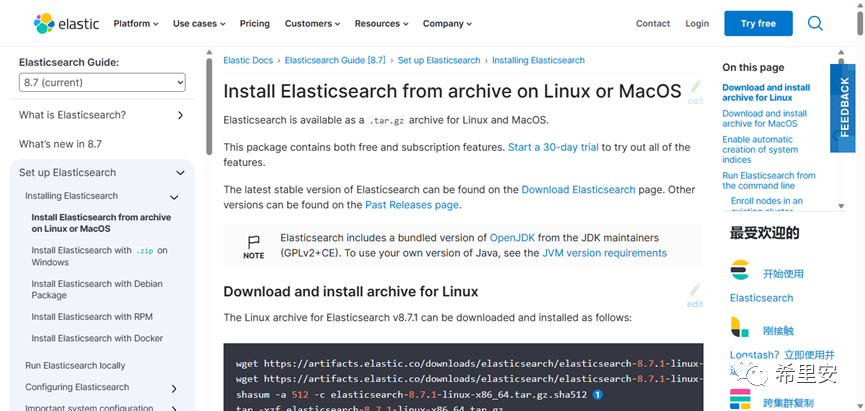 wget https://artifacts.elastic.co/downloads/elasticsearch/elasticsearch-8.7.1-linux-x86_64.tar.gztar -xzfelasticsearch-8.7.1-linux-x86_64.tar.gzcd elasticsearch-8.7.1/./bin/elasticsearch # 启动Elasticsearch