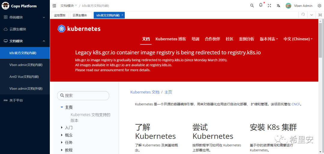 今天系统前端开发进度暂无进度:只添加了云原生模块导航菜单,使用自带iframe模块内嵌了k8s的官方文档。