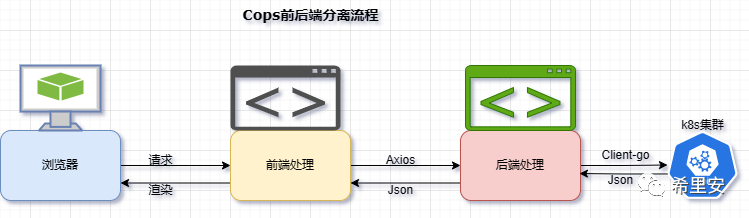 我们设计的前后端分离的流程大致如上图所示,所以说,我们今天主要是将前后端都跑起来,然后把后端返回的数据渲染到页面上。这样一个简单的前后端分离的项目算是完成了。