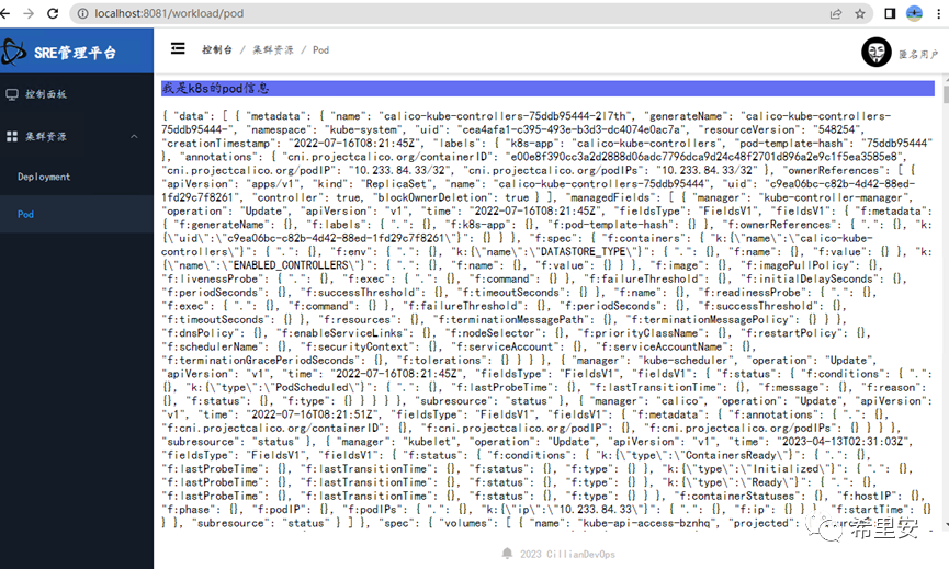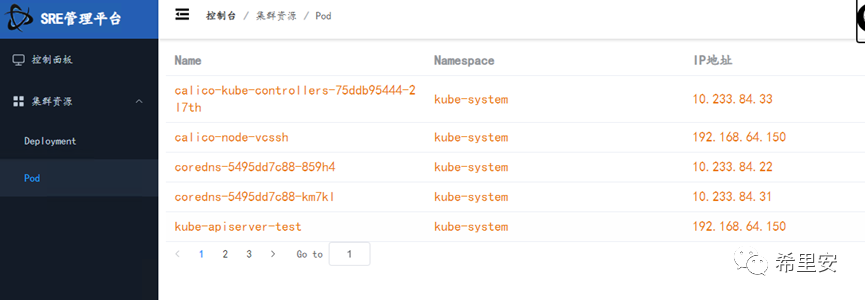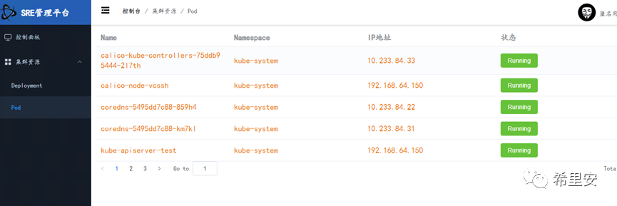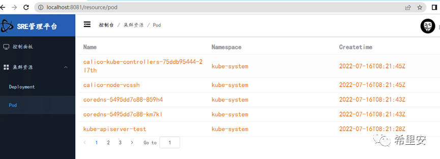 这里就是一个简单的表格加一个分页功能展示,从后端返回的k8s中kube-system命名空间的pod相关的信息,包括名字、命名空间、创建时间的功能,当然还可以根据需求,添加其他功能,比如查看IP。