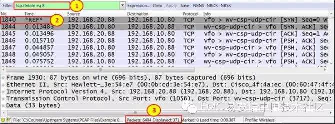 1. 我们查看TCP stream 8(1),连接开始于TCP SYN/SYN-ACK/ACK。如下图(2)所示。可以看到整个连接花费了371个报文(3)。