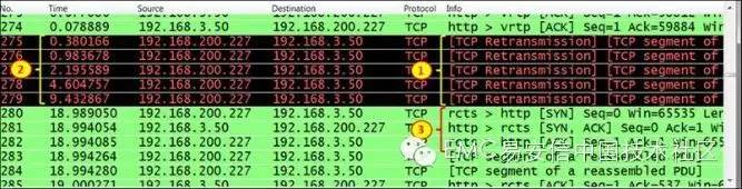 四。另一个可能发生的问题是抓包文件反映出有软件问题。以下截图中可看到5个重传(1),并且客户端打开了一个新的连接(3)。看起来像一个TCP问题但只发生在软件中一个特定窗口。这只是由于一个软件进程停止运行,因此TCP无法对客户端作出响应(2)。