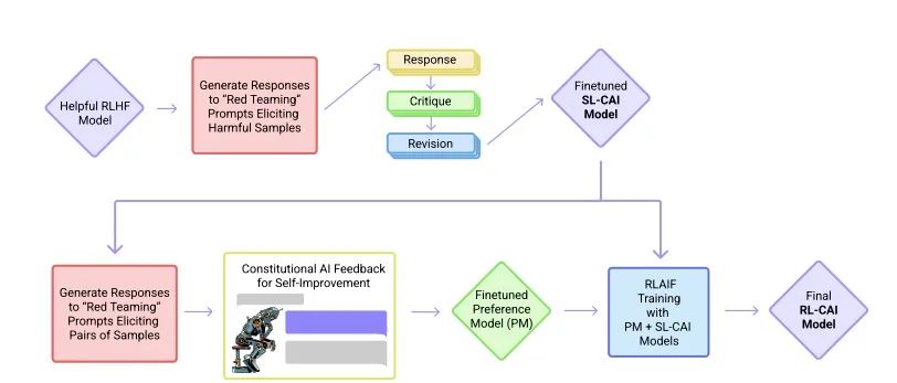 Claude 和 ChatGPT 都依赖于强化学习(RL)来训练偏好(preference)模型。CAI(Constitutional AI)也是建立在RLHF的基础之上,不同之处在于,CAI的排序过程使用模型(而非人类)对所有生成的输出结果提供一个初始排序结果。CAI用人工智能反馈来代替人类对表达无害性的偏好,即RLAIF,人工智能根据一套constitution原则来评价回复内容。▌5.2 补足数理短板