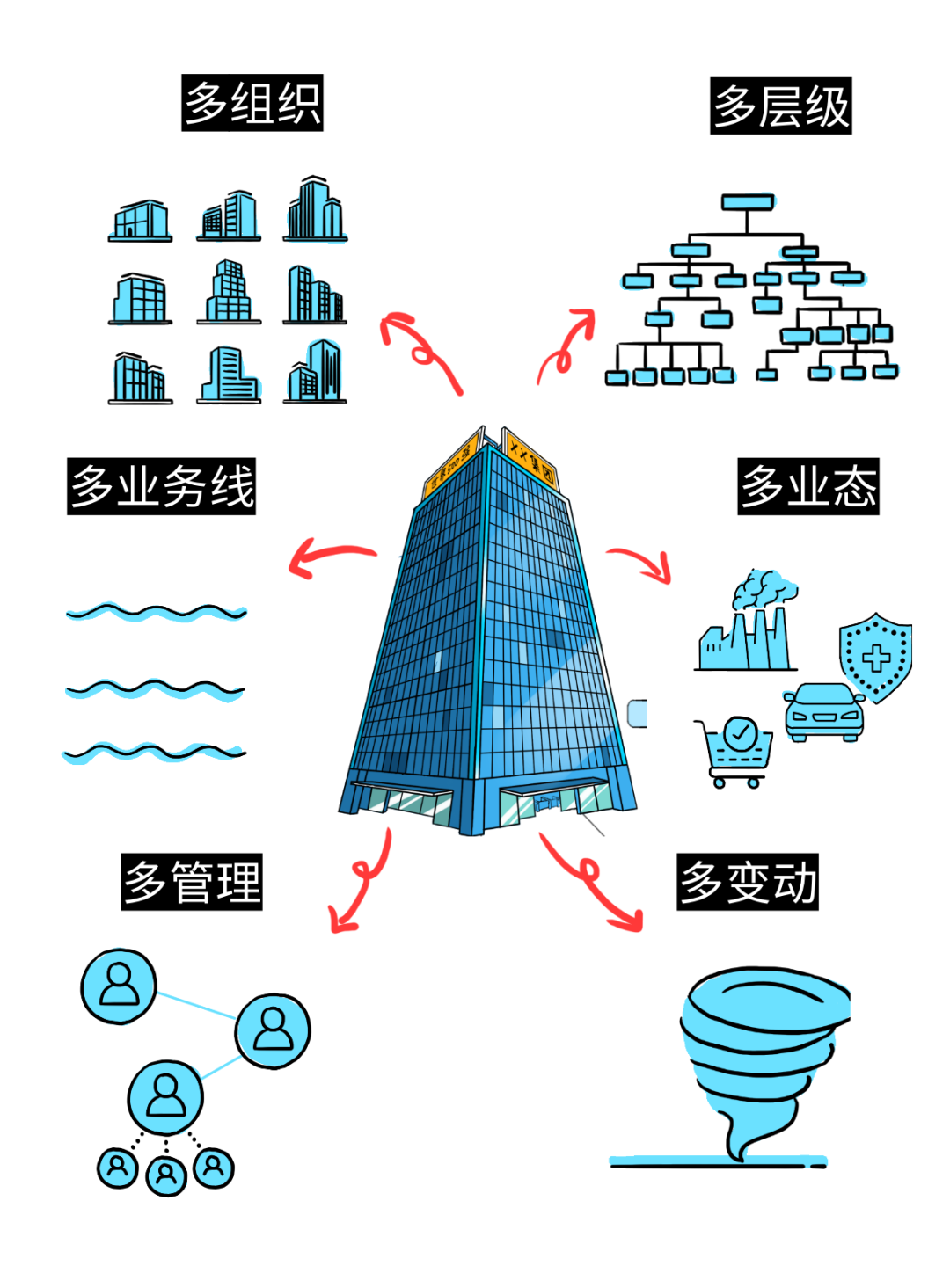 分支机构多、部门多、员工多、供应商多、流程多、系统多...