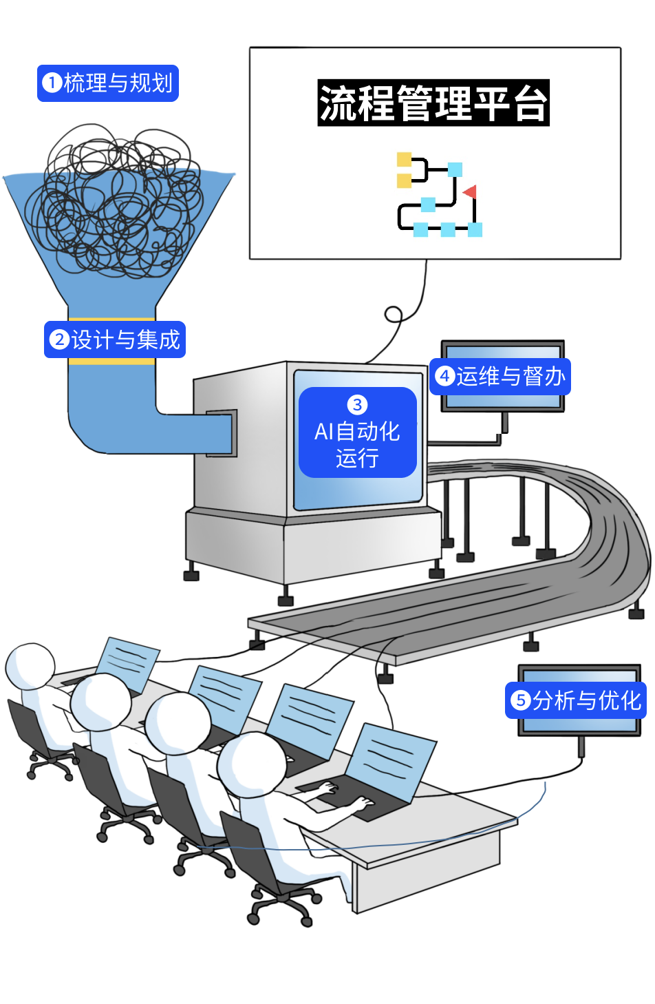 梳理与规划→设计与模拟→流程集成→执行与自动化→运维与监控 →分析与优化