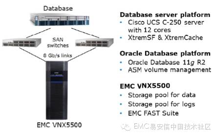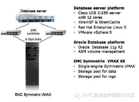 两个解决方案中分别使用安装XtremSF和XtremCache的Cisco UCS C-250服务器,安装VMware vSphere 5,运行Oracle 11g数据库和ASM卷管理软件。通过光纤交换机连接到VMAX和VNX存储阵列。
