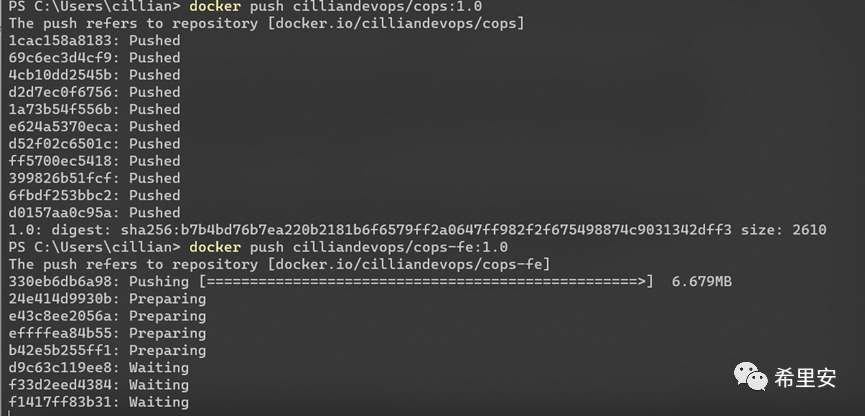 1、将vue和go前后端项目构建为就像,推送到了公开仓库,名称为cilliandevops/cops-fe和cilliandevops/cops