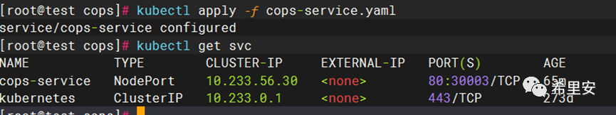 yamlapiVersion: v1kind: Servicemetadata:name: cops-svcspec:type: NodePortports:-port: 80 #Service暴露的端口号nodePort: 30003 #节点端口号targetPort: 8080#Pod上服务实际监听的端口号selector:app:cops