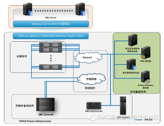 下图显示了用于在 VSPEX Proven Infrastructure 上支持 SQL Server 平台的经验证基础架构示例。在此解决方案中,所有 SQL Server 2014 实例都作为虚拟机部署在 vSphere 群集上。VMware vCenter Server 需要使用数据库服务来存储配置和监视的详细信息。XtremIO 提供了后端存储功能。可以使用经验证可用作 VSPEX Proven Infrastructure 的一部分的任何型号。