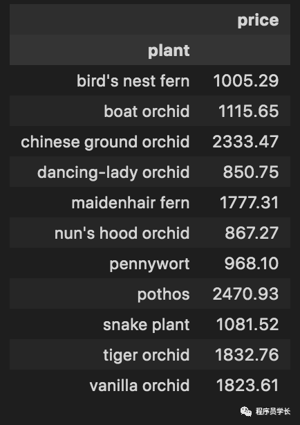 接下来,假设我们想查看每个植物物种的花费。我们可以使用 pd.pivot_table() 或 .groupby()进行聚合。