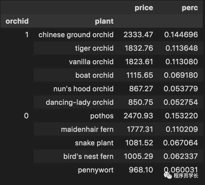 好奇每种植物对温室总成本的贡献?将每个值除以所有行的总和,并将该输出分配给名为 “perc” 的新列: