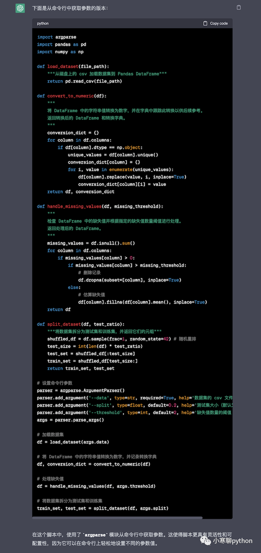 在此版本中,ChatGPT 使用 argparse 模块将文件路径、测试集/训练集分割大小和每条记录缺失值数量的阈值作为命令行参数作为输入。