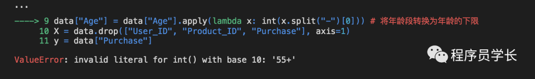 上面的代码报错。年龄列 "55+" 不能转换为 int。