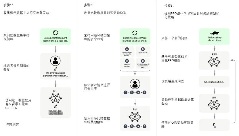 GPT 3.5本身很难理解人类不同类型指令中蕴含的不同意图,也很难判断生成内容是否是高质量的结果。为了让GPT 3.5初步具备理解指令的意图,首先会在数据集中随机抽取问题,由人类标注人员,给出高质量答案,然后用这些人工标注好的数据来微调 GPT-3.5模型(获得SFT模型, Supervised Fine-Tuning)。此时的SFT模型在遵循指令/对话方面已经优于 GPT-3,但不一定符合人类偏好。