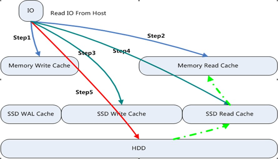 step 4 ►从 SSD 的“SSD Read Cache”中查找是否存在所需I/O数据,如果存在,则直接返回, 同时增加该I/O数据的热点访问因子;如果热点访问因子达到阈值,则会被缓存在 SSD 的“SSD Read Cache”中,如果不存在,执行Step 5;