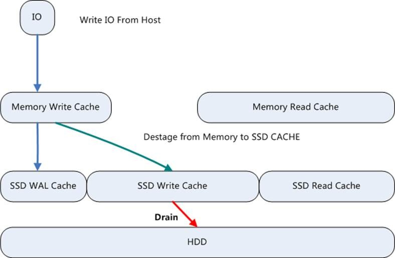 主机发送的写 IO 操作(图中 Write IO From Host)时,会将 Write IO在 Memory Write Cache 内存中保存一份,同时同步以日志的方式(采用固定的 2+2 小分片 EC)记录到 SSD WAL Cache 中并返回成功完成本次写操作,这个流程通常称为 Host Write IO 流 程。通常 SSD Disk Cache 分为两个部分:SSD Write Cache 和 SSD Read Cache。