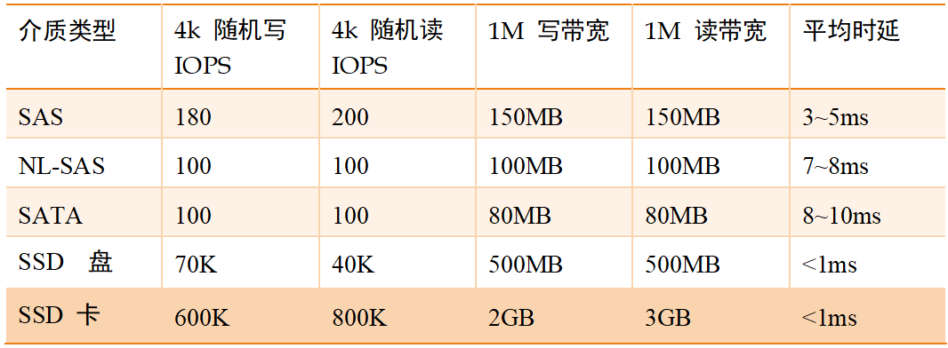 下图为不同介质的性能对比数据,对于随机小 I/O,SSD 比 HDD 存在几十到上百倍的性能优势,但是相对顺序I/O来说,优势其实并不明显。