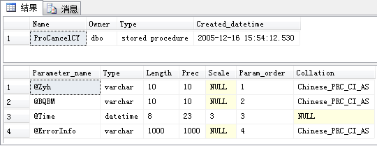 USE YSGZZ; --选择数据库GOEXEC sp_help 'ProCancelCY'; --存储过程名称GO