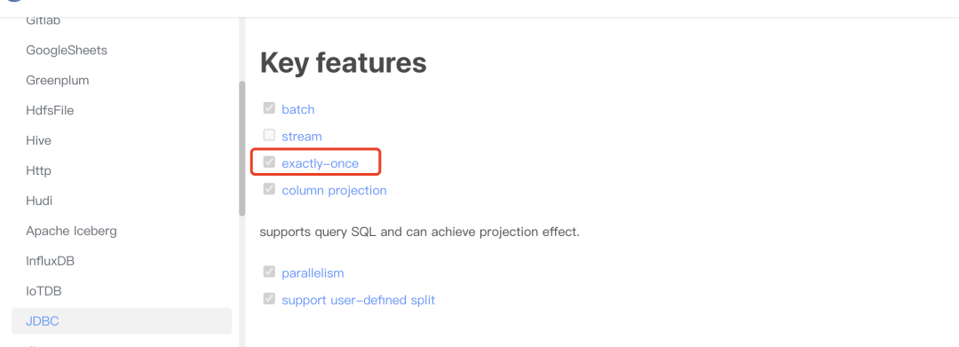 在Sink连接器的文档上,我们也能看到如下图中的标识: