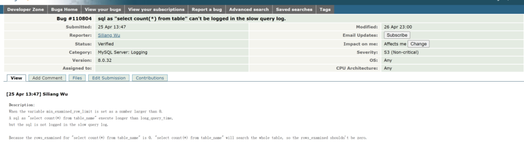 都会遍历全表或二级索引然后统计行数,不应该把 Rows_examined 计算成 0。因此我在官网上提交了此 bug,官方也证实了这个 bug:https://bugs.mysql.com/bug.php?id=110804