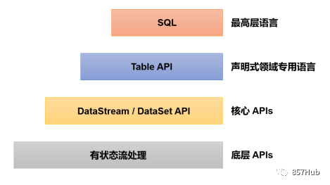 之前所介绍的流处理API,无论是基本的转换、聚合,还是更为复杂的窗口操作,其实都是基于DataStream进行转换的;所以可以统称为DataStream API,这也是Flink编程的核心。而我们知道,为了让代码有更强大的表现力和易用性,Flink本身提供了多层API,DataStream API只是中间的一环,如图所示: