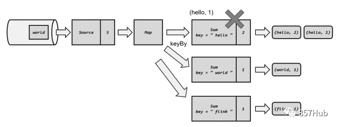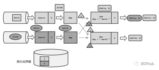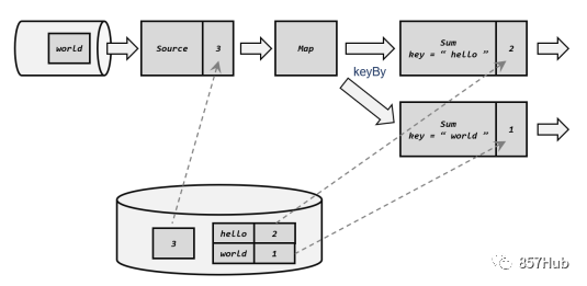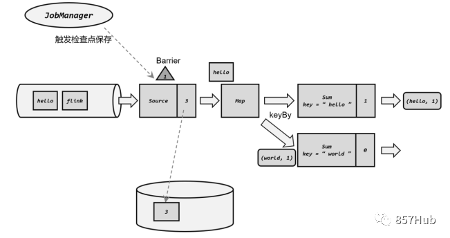 分界线(barrier)会在算子间传递下去。每个算子收到barrier时,会将当前的状态做个快照,保存到状态后端。