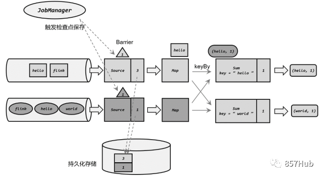 如图所示,JobManager通知各个TaskManager启动检查点保存,Source任务会将检查点分界线(barrier)注入数据流。这个barrier可以将数据流中的数据,分为进入当前检查点的集合和进入下一个检查点的集合。