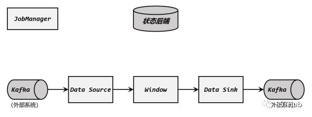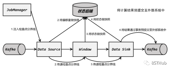 这是一个Flink与Kafka构建的完整数据管道,Source任务从Kafka读取数据,经过一系列处理(比如窗口计算),然后由Sink任务将结果再写入Kafka。Flink与Kafka连接的两阶段提交,离不开检查点的配合,这个过程需要JobManager协调各个TaskManager进行状态快照,而检查点具体存储位置则是由状态后端(State Backend)来配置管理的。一般情况,我们会将检查点存储到分布式文件系统上。实现端到端exactly-once的具体过程可以分解如下: