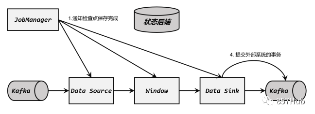 ③当Sink任务收到JobManager发来检查点完成的通知时,正式提交事务,写入的结果就真正可用了。