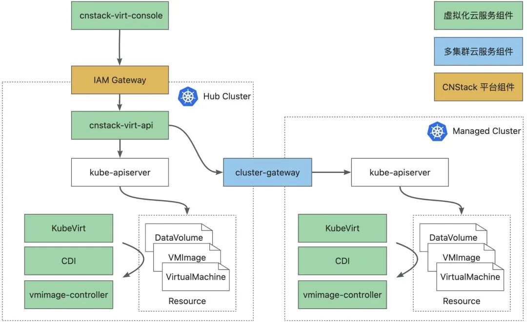 在 CNStack 2.0 中,虚拟化服务以独立云服务的形态进行部署,即能复用 CNStack 平台与多集群服务提供的多租资源管理、统一网关、集群管理、多集群资源分发等基础能力,又能不失灵活性地独立演进与发布。