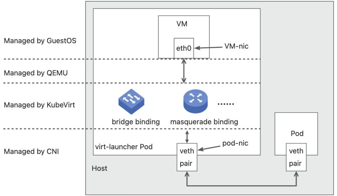 bridge:pod-nic 与 VM-nic 直接通过 layer-2 bridge 连接,VM-nic 通过 DHCP 协议直接获取到 pod-nic 的 layer-3 IP,Pod 充当了交换机的角色。 masquerade:VM-nic 获取到的是本地 IP(只在 Pod 有效,一般固定为 10.0.1.2),VM-nic 发出/收到的流量都被 Pod 内的 iptables/nftables 规则 NAT 为 Pod IP 进行传输,Pod 充当了路由器的角色。 sriov, slirp, passt 等其他 KubeVirt Network Binding 就不一一介绍。