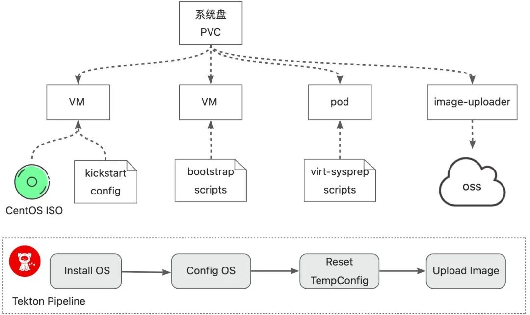由于大多数虚拟机用户缺乏构建 Golden Image[8] 的背景知识,一般只能提供 ISO 光盘文件(或者直接从发行版的官网下载)。我们基于 KubeVirt 与 Tekton CICD[9] 搭建了虚拟机镜像构建流水线(VMImage Pipeline),基于 ISO 光盘文件,自动构建出 Golden Image 并上传到 OSS 等集中式存储中,以供创建虚拟机。